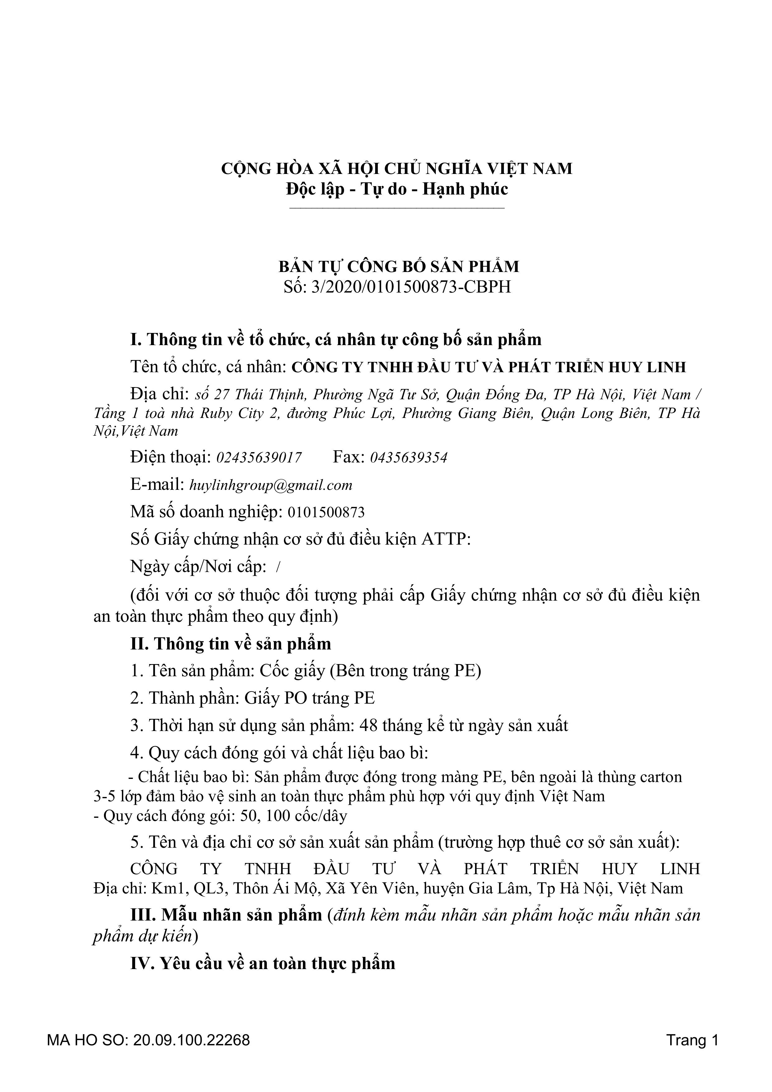 | Chất liệu: | Giấy tráng PE 1 mặt |