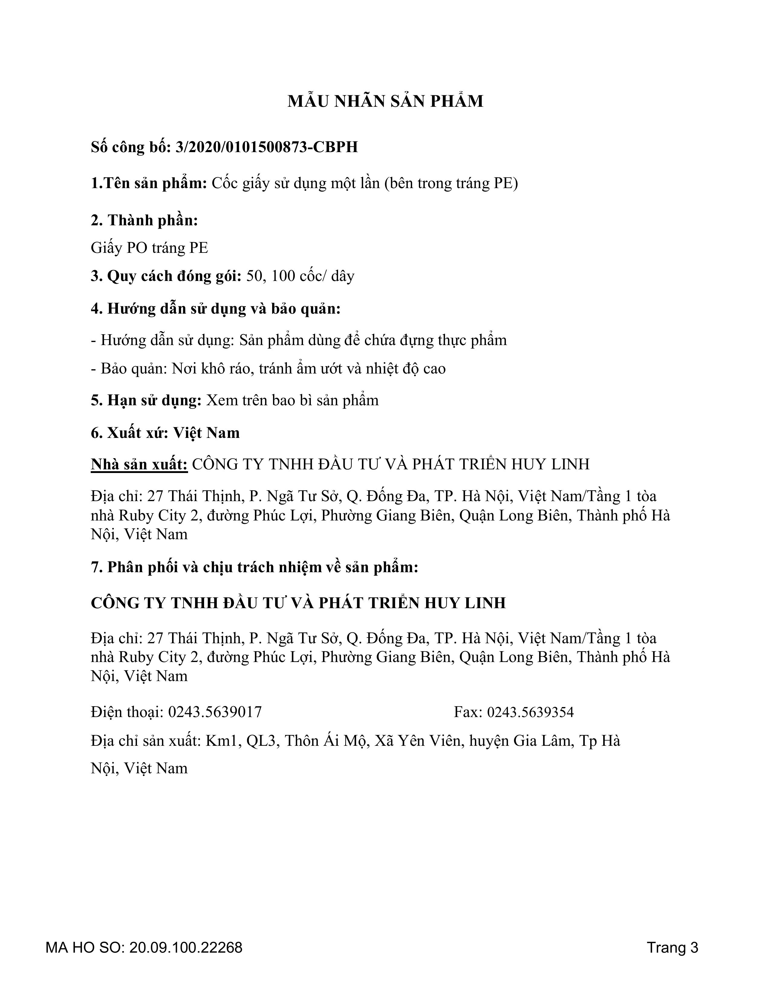 | Chất liệu: | Giấy tráng PE 2 mặt |